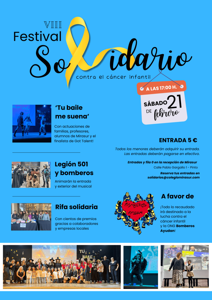 Mirasur School celebrará el próximo sábado 21 de febrero su VIII Festival Solidario contra el Cáncer Infantil, una cita ya emblemática en el centro educativo, que cada año reúne a la comunidad escolar con un mismo propósito: ayudar a los niños que luchan contra esta enfermedad.